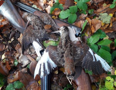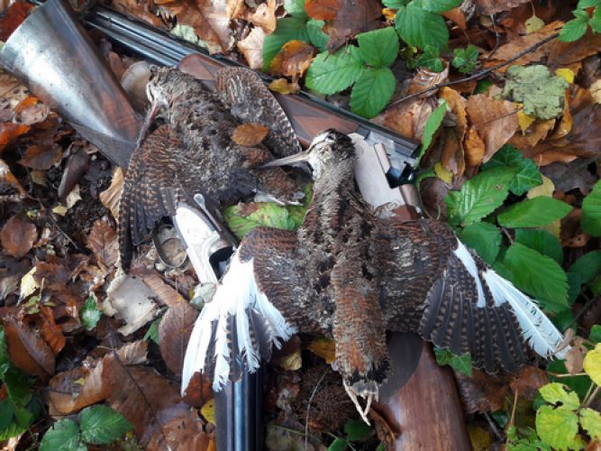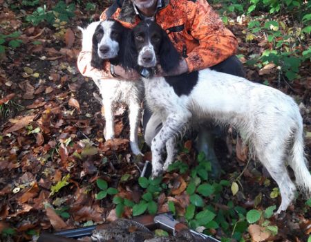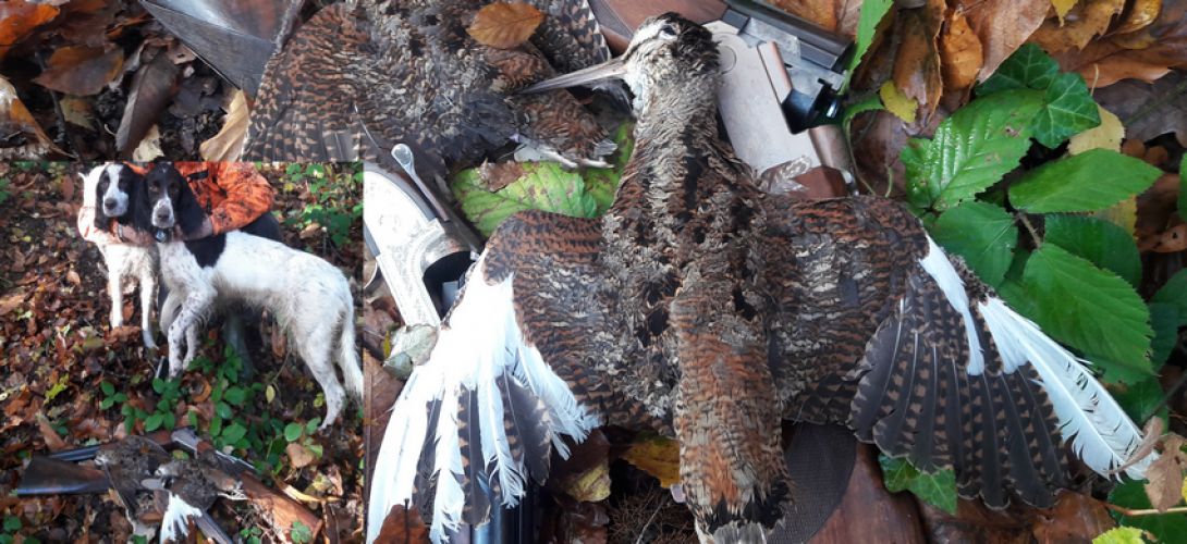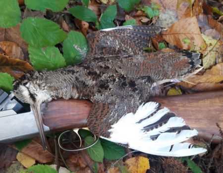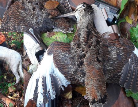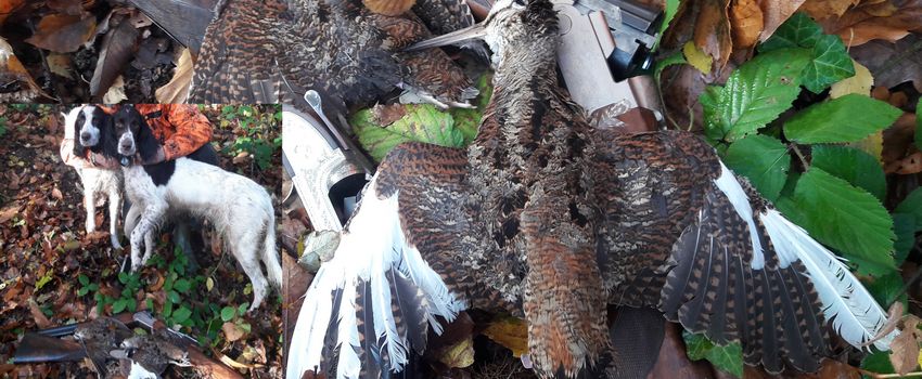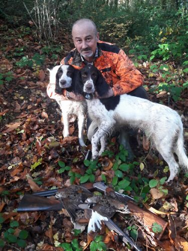 Lubie nous l'arrêta à nouveau et cette bécasse eut alors la malchance de passer à portée de fusil...C'était bel et bien une bécasse et elle avait les ailes blanches. Elle accusa mon coup de fusil mais continua son vol et se posa dans la bordure d'une chênaie... Hella et Lubie nous précédèrent...et se mirent toutes les deux à l'arrêt "patron"..."Manu" et moi-même, nous nous plaçâmes de chaque côté des chiens dans ce bois clair...