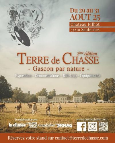 Dans le cadre de la manifestation " Terre de chasse au château FILHOT à Sauternes (33)" , le Club de l'Epagneul Français organise une exposition Régionale d'Elevage (sans attribution de CACS) le 31 août 2025.