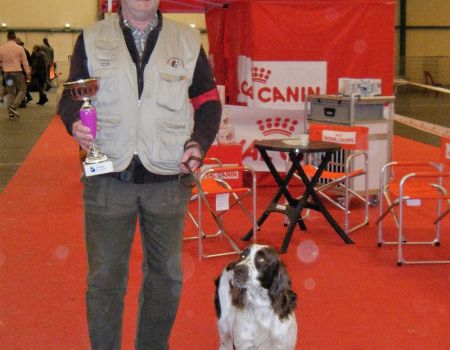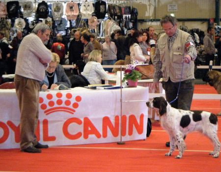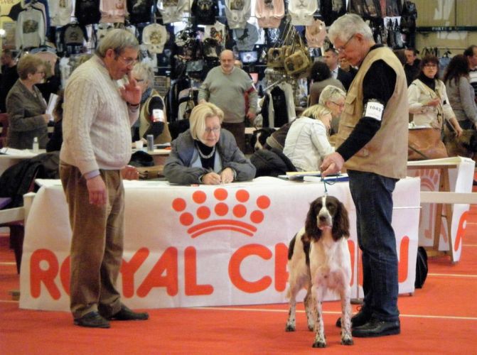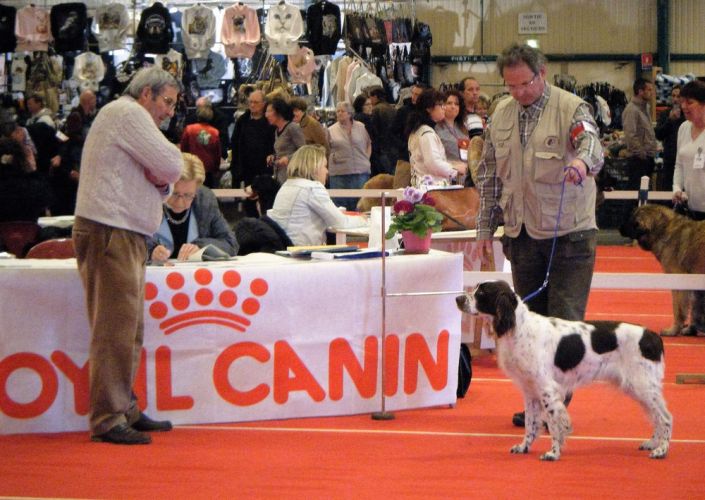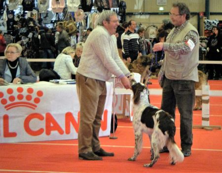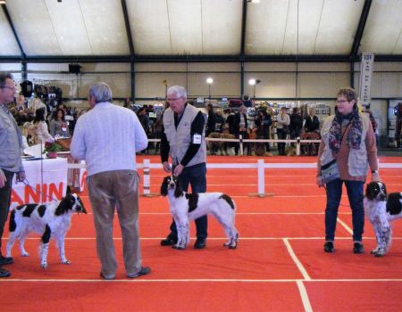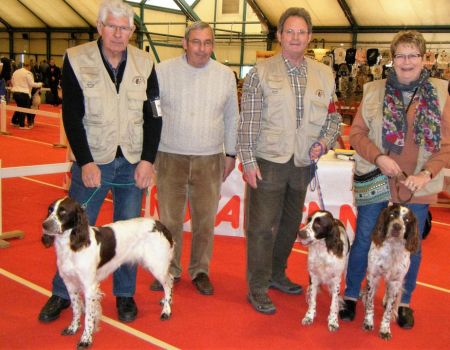 Rencontre intimiste de trois Epagneuls Français à l'Exposition Canine Nationale de Chateauroux, dans l'Indre, le dimanche 24 avril 2016, jugés par M. Pascal Boué.