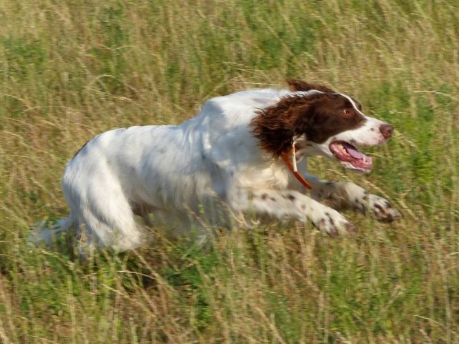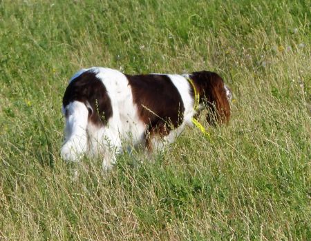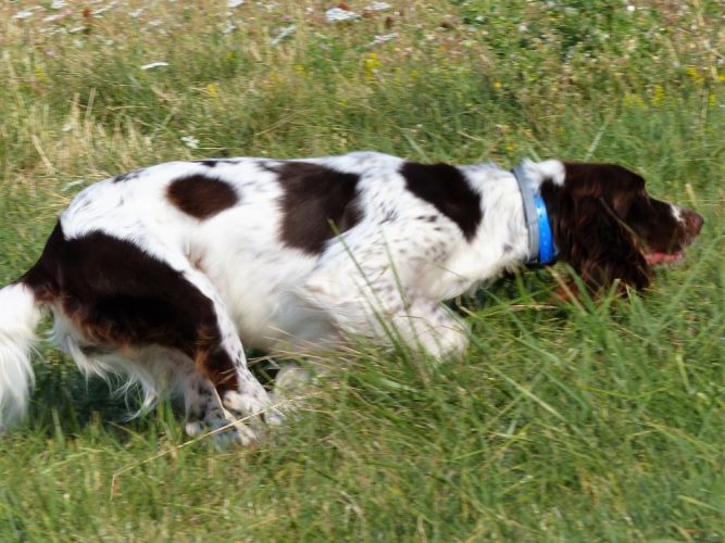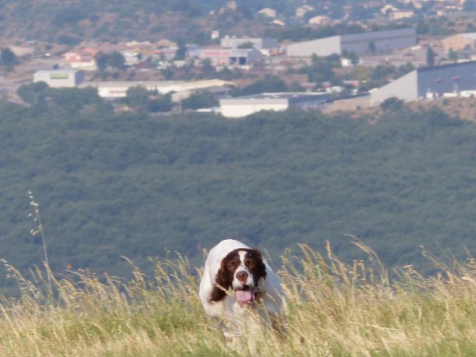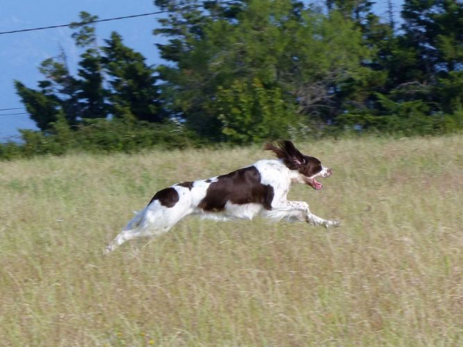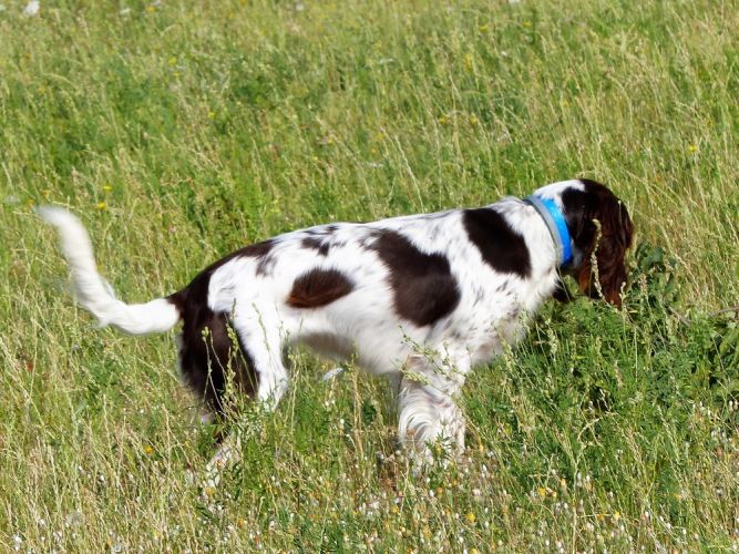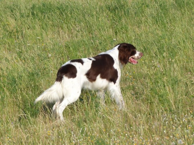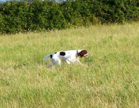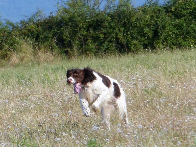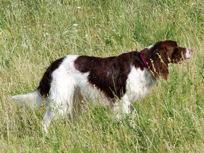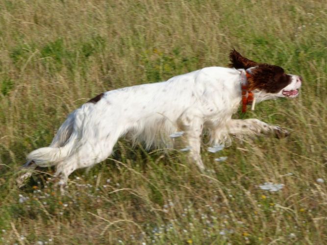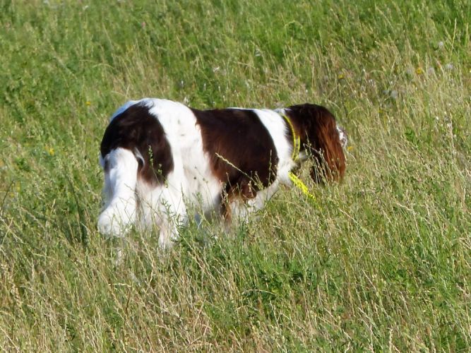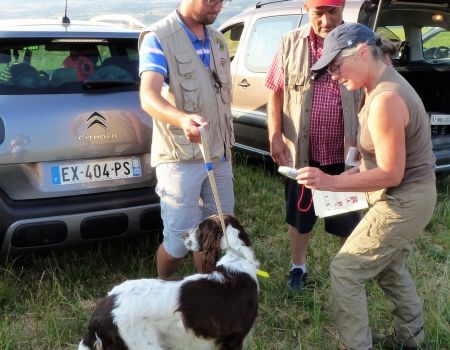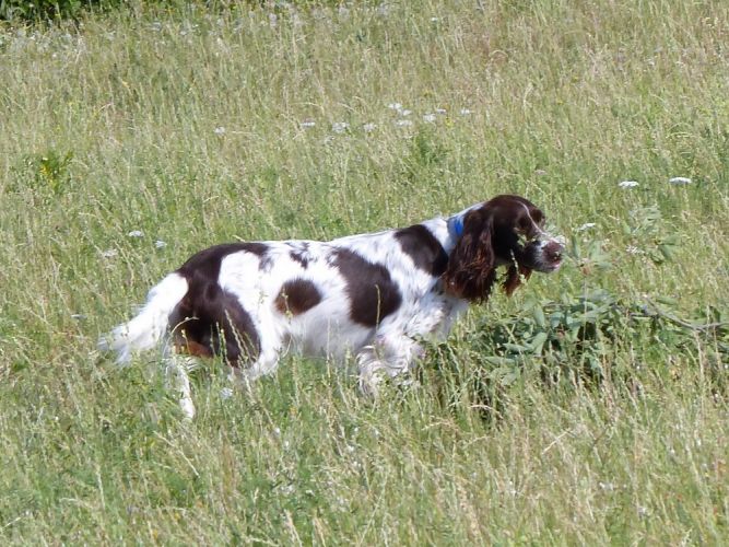 Tout d’abord Moka à Eric Thouy, dotée d’une quête désordonnée mais assez ample au début. Chienne qui a des capacités mais semble bridée ; les allures sont excellentes. Le port de tête pourrait être plus haut, arrêt très court, attend son conducteur, court sous l’aile. Elle termine à la deuxième place.
