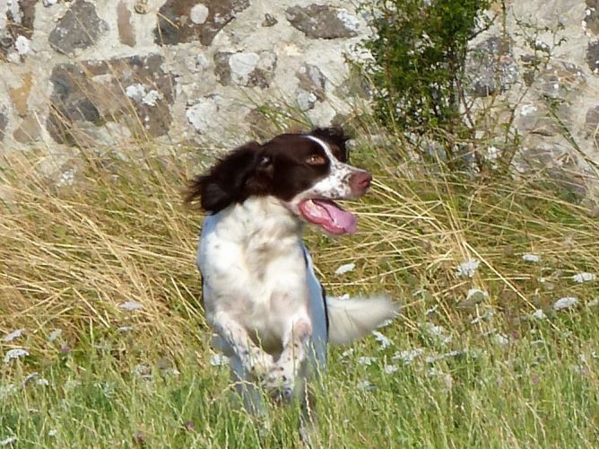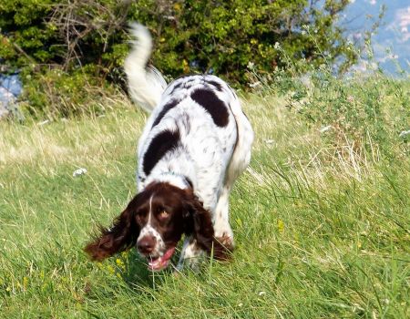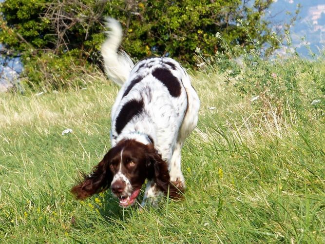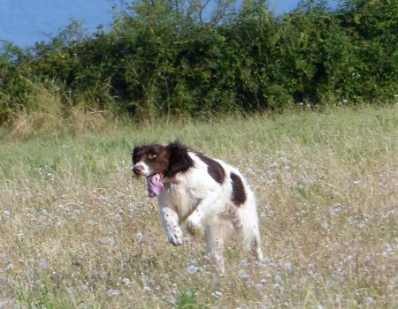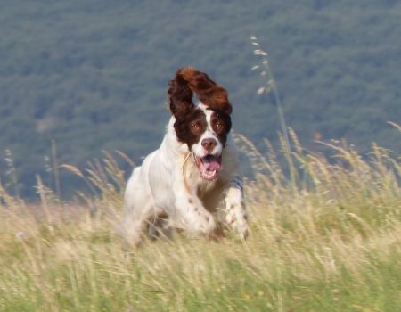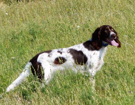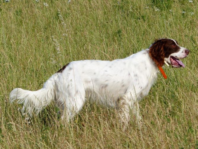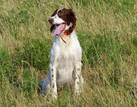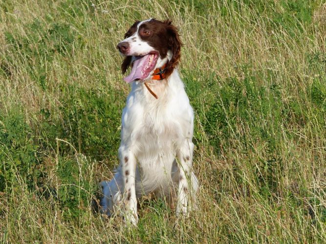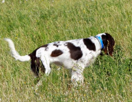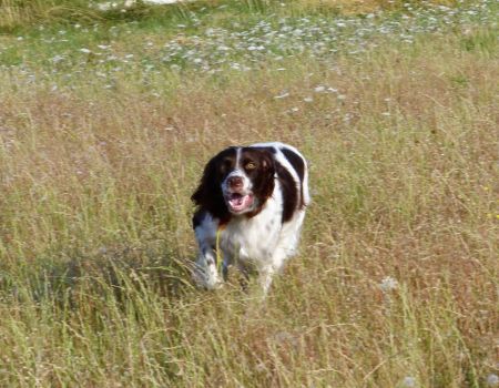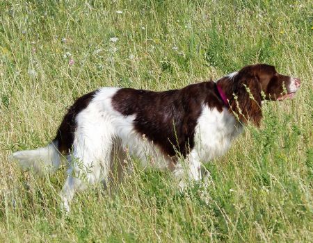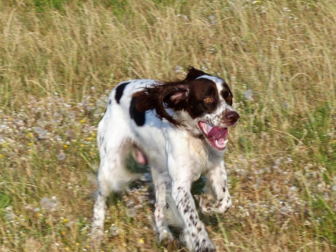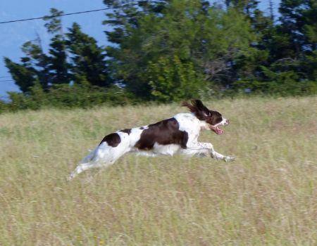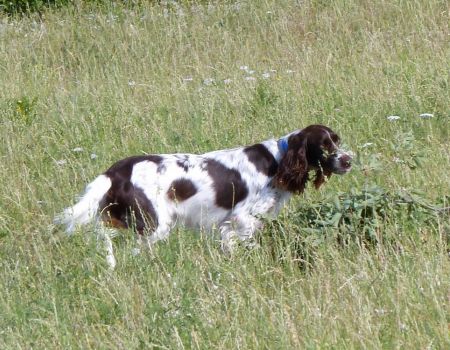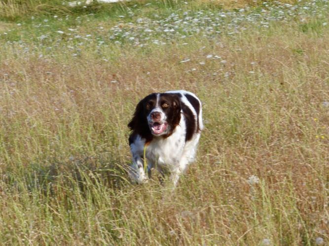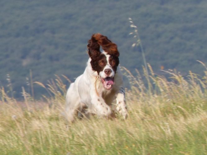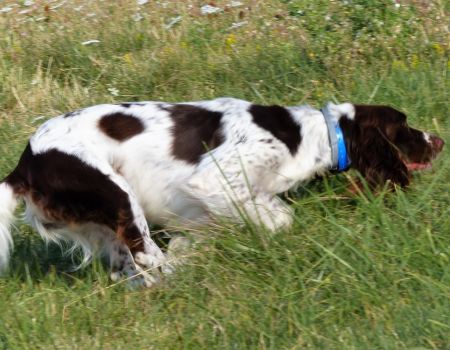 Tout d’abord Moka à Eric Thouy, dotée d’une quête désordonnée mais assez ample au début. Chienne qui a des capacités mais semble bridée ; les allures sont excellentes. Le port de tête pourrait être plus haut, arrêt très court, attend son conducteur, court sous l’aile. Elle termine à la deuxième place.