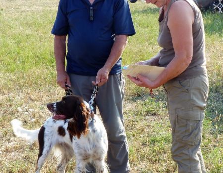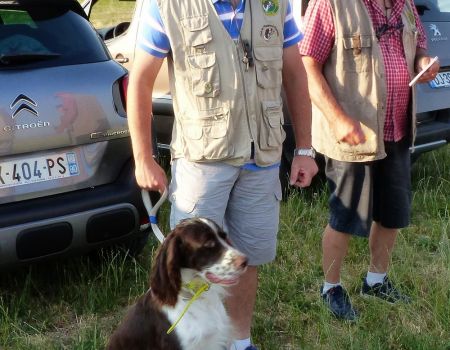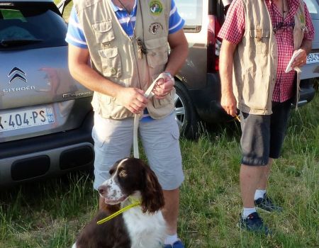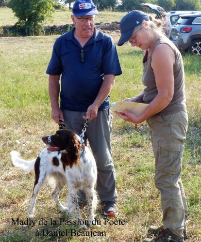 Vient le tour de Madly de la Passion du Poète à Daniel Beaujean. Elle s’installe parfaitement sur le terrain, avec d’excellentes allures et port de tête, bien a l’écoute de son conducteur, indique l’oiseau, le remonte sans prendre de pose d’arrêt. Suite à son excellente prestation, nous décidons de la reprendre. Là, elle indique l’oiseau et l’arrête parfaitement, attend son conducteur, court sous l’aile. Nous lui octroyons la première place. Madly termine 1er des femelles et remporte le challenge de la Coupe de France des Jeunes.