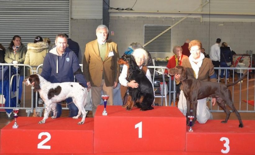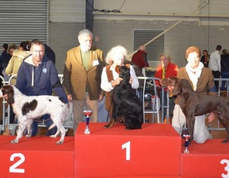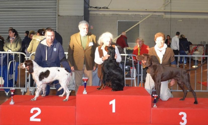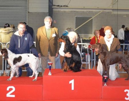 Il est entre 2 éleveuses connues et reconnues dans leur race, Mme VERSAVAU et sa setter gordon, Souinet des Pralines d'Aubejoux (1ère) et Mme GRASSART avec son braque allemand, Spartacus Moon Eyes.